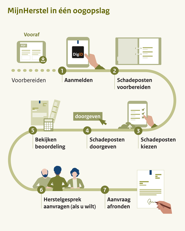 Met MijnHerstel kunt u uw aanvullende schade helemaal online doorgeven. U kunt direct aan de slag. Het advies is om dit samen te doen met een advocaat of iemand die u vertrouwt. U geeft zelf de toelichting bij uw schadeposten en uploadt u documenten.